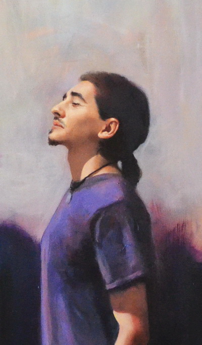 Personajele sunt artistul insusi si colegii sai de la facultate. Pe Corina Raiciu am prins-o ca sa o fotografiez alaturi de eu-l ei din culori de ulei intinse pe panza.