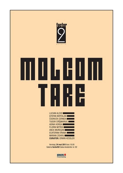Galeria factor92 debuteaza in forta cu o expozitie-manifest – calma, calda, dar taios asezata. Molcom tare identifica zona de maxim interes pentru factor92: arta care se simte in largul ei ca arta, dar care iese cu toate pinzele sus in acest larg. Arta care intinde pina la limita suportabilului plasticitatea, tactilul, intensitatea emotionala a intimitatii afisate, angajamentul existential ce merge de la mistica la politica, dar care nu este niciodata simplu text, ci ramine inscris, cu incapatinare, intr-un obiect patimit si deplin rumegat estetic. Adincirea artistului concomitent in sine, in lume si in opera este ceea ce arata Molcom tare. Nu obiecte placute, simple decoratiuni interioare, ci lucrari apasatoare ce impodobesc interioritatea celui ce-si asuma riscul de a lua arta drept altfel decit o simpla demonstratie, declaratie de intentii (politice etc.) sau mesaj pre-fabricat. De aceea Molcom tare este o expozitie totodata grava si delicata, in care se impletesc texturi suculente cu suprafete pretioase pentru a impunge, totusi, privitorul, sadind in el nesiguranta, grija, atentia. Spectacolul, retorica, militantismul, la fel ca si exhibarea cultural-bibliografica de tip criticist nu reprezinta repere semnificative pentru factor92. Molcom tare arata ca senzationalul nu rezida nici in idee nici in scandal (cu atit mai putin in acela atit de subtire, pur vizual), ci in interioritate, in masurarea acesteia cu duritatatea timpului si a lumii. Invaluind stridentele cu un exces tandru, Molcom tare amenajeaza spatii primitoare, unde poate sa se dedea dezvaluirii discrete a cutremurelor launtrice. Apologie a artei asa cum (nu o mai) stim, Molcom tare are o unica ambitie – aceea de a propune iubitorilor de arta veritabile bunuri vizuale de folosinta indelungata, capabile sa bucure sau sa tulbure si azi si miine.